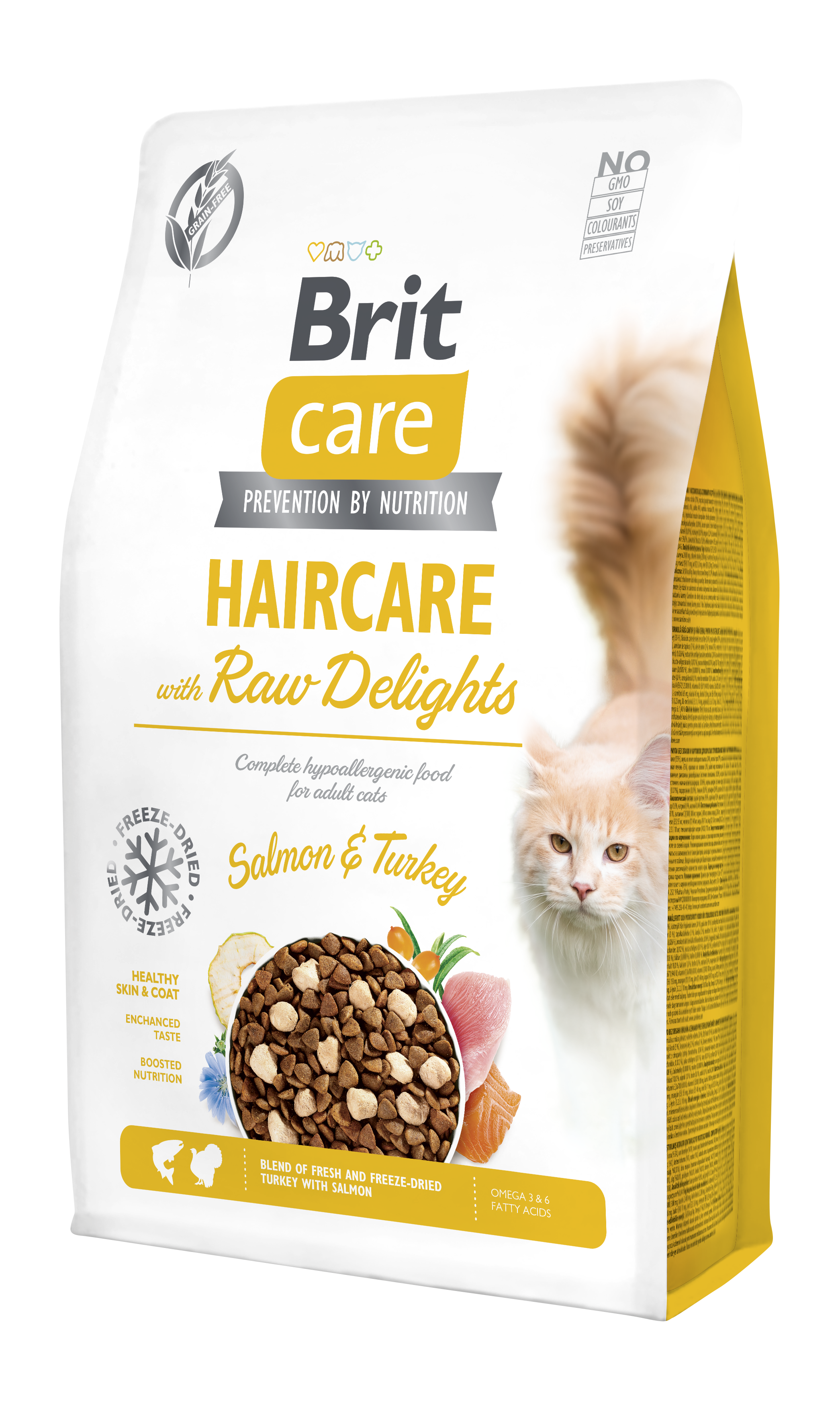 Brit Care Cat Raw Delights Haircare Salmon & Turkey – karma sucha dla kotów długowłosych, wspierająca pielęgnację od wewnątrz