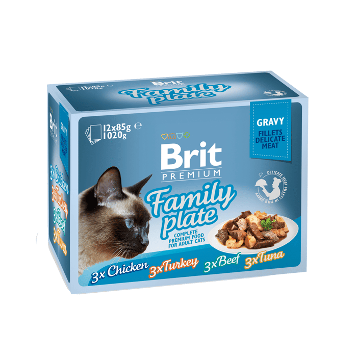 Zestaw Family Plate Brit Premium Cat Pouches Fillets in Gravy, mix smaków w sosie, 12 x 85g